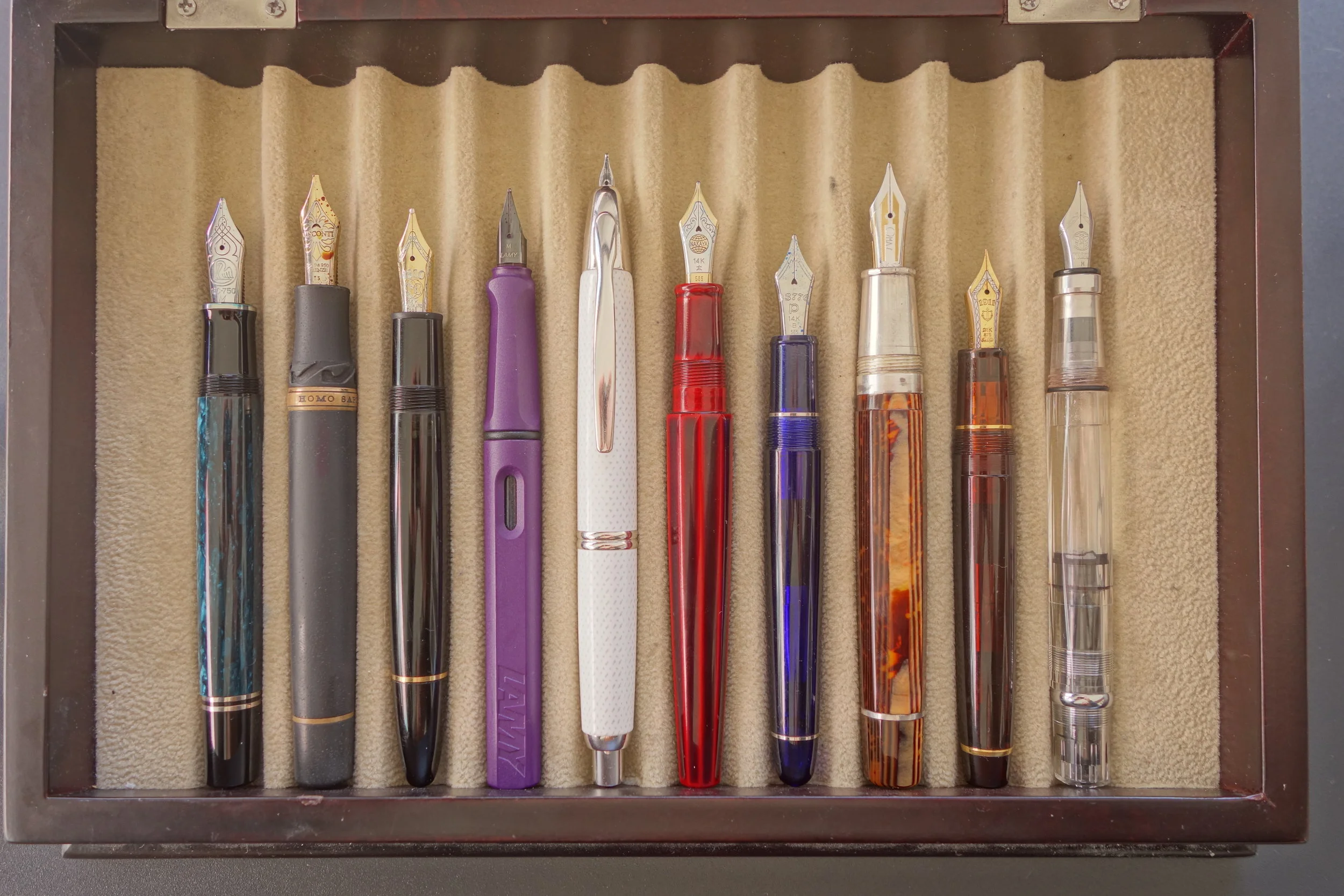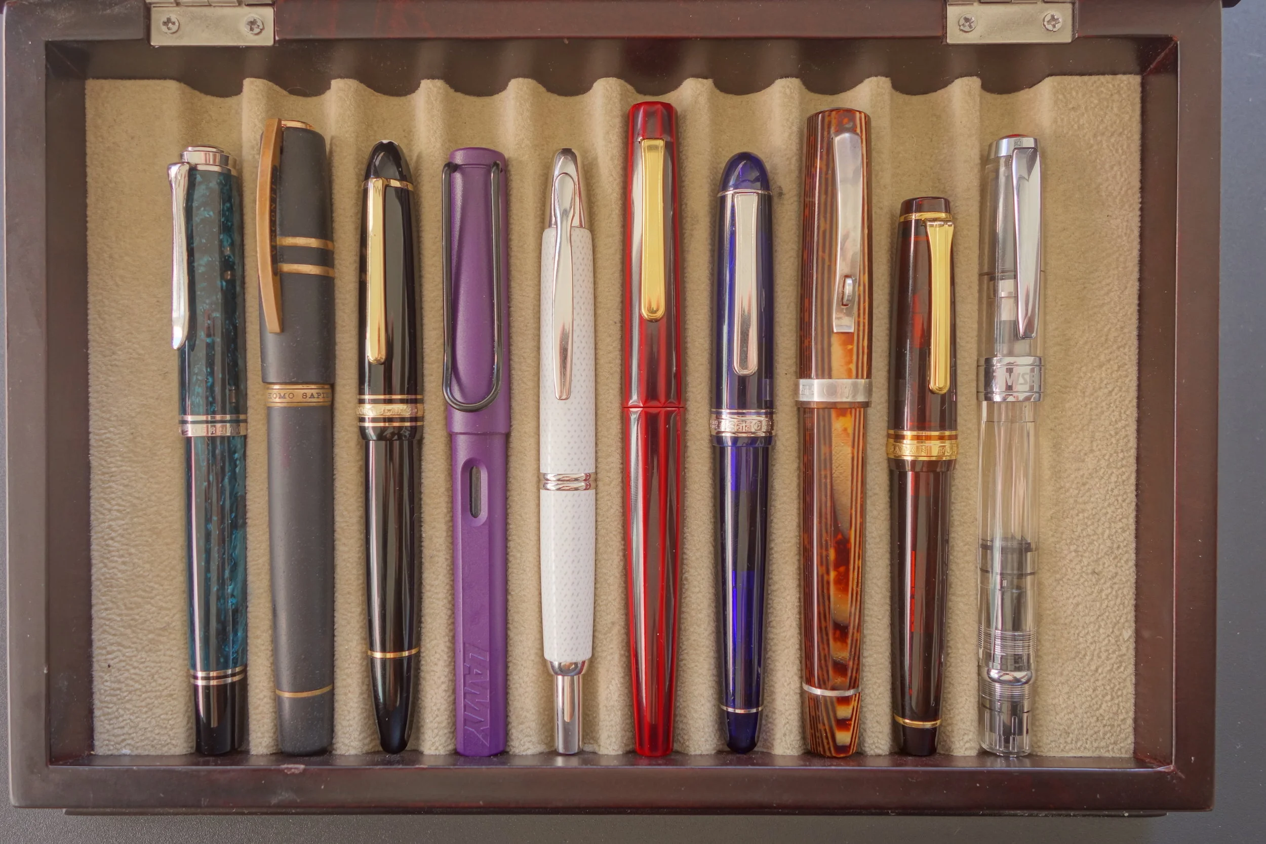 Left to right: Pelikan M805 "Ocean Swirl", Visconti Homo sapiens "Bronze Age", Montblanc 146, Lamy Safari "Dark Lilac", Pilot Vanishing Point "White Carbonesque", Nakaya Decapod Writer "Aka-tamenuri", Platinum Century #3776 "Chartres Blue", OMAS Paragon Arte Italiana "Arco Brown", Sailor Pro Gear (Wancher exclusive) "Mocha", and TWSBI Diamond 580.