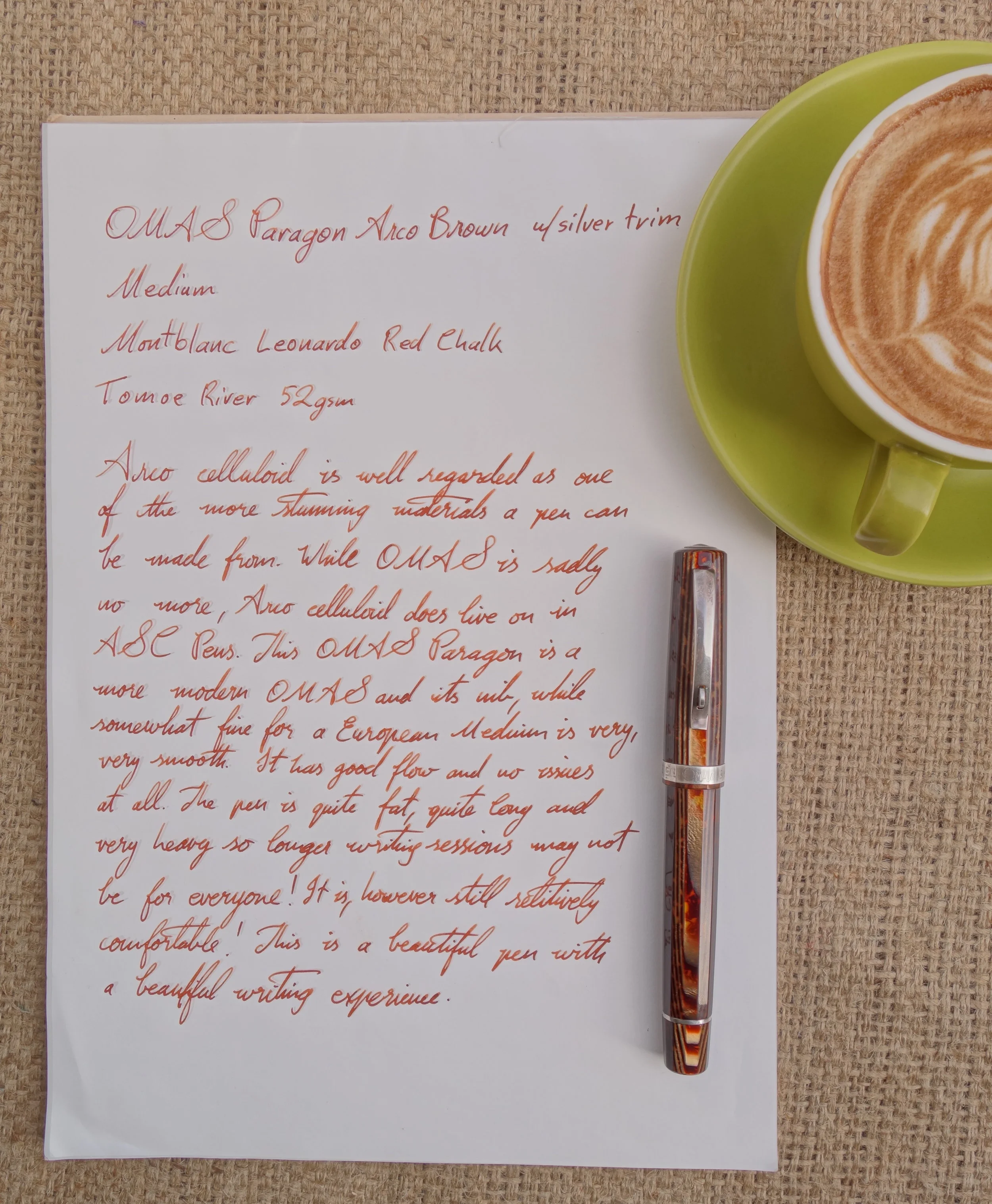 The nib is a bi-colour nib that is rhodium plated with gold as the decoration. The nib has "OMAS" inscribed on it as well as 18 K and 750 (75% gold) and "M" for its Medium nib size. The nib itself is superb. Buttery smooth without a hint of a baby's bottom. Decently wet but not a gusher and it very writes nicely with drier Montblanc inks (in the pen for this review is Montblanc Leonardo Red Chalk) and wet Sailor inks. It has a somewhat thin line for a Western Medium nib size, however (see below).