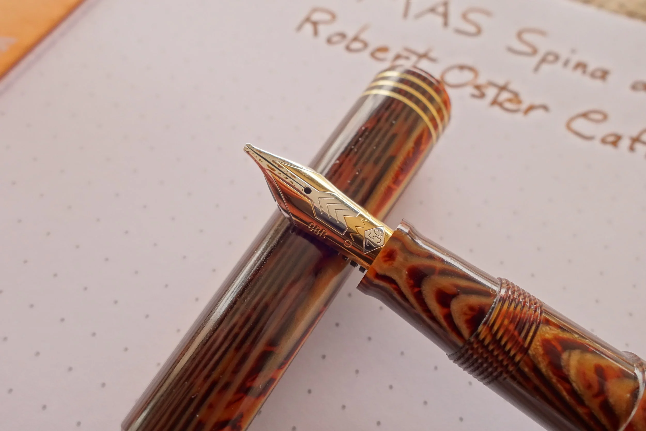 The OMAS I traded this for is an OMAS Spina di pesce fountain pen where the brown Arco celluloid is cut from a angle in-between 90° and 0° to give it a fishbone like look (the cap is still the same cut as this Paragon, however). The pen is a similar weight and size to a Lamy 2000 which is a weight and size I really like. The nib is a left-foot oblique double broad which I'm not too fond of as I don't rotate the pen naturally but it is nice and smooth; I think I'll get this turned into a Cursive Italic one day! I'm happy with the trade. Some photos below of this pen.