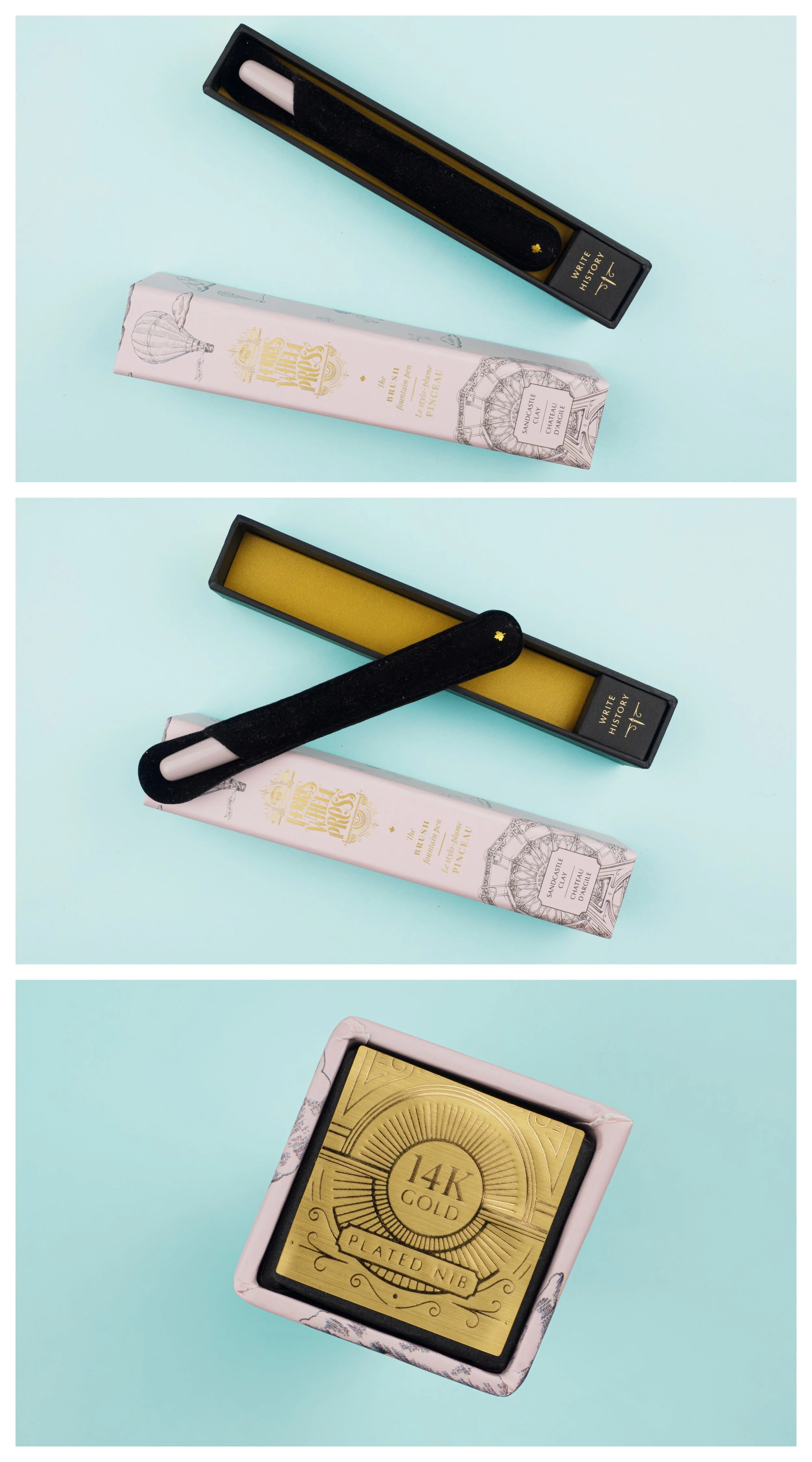 The packaging is a long thin cardboard box with a colour that matches the pen. This pen, Sandcastle Clay, has a slightly pink hue to it and so the box is also a light pink. The thin box is covered in line artwork and a gold Ferris Wheel Press logo. The French name for this colour is Château d'Argile (which Google Translate says is 'Clay Castle' so it would seem, unlike some of the inks, that this is a straight translation rather than a unique French name). It is here we find that the pen is designed and assembled in Toronto, Canada. This box slides off to reveal a cardboard tray that holds the pen along with "Write History" on a chin below the pen and a gold coloured paper behind the pen. On the reverse is a thanks for supporting Canadian design and craftsmanship, a encouraging quip, patent information and care instructions which read: