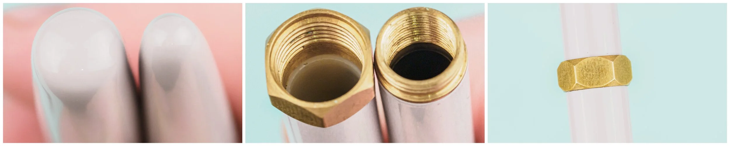 The finials of the Brush Fountain Pen are simply just round although each taper differently with the body tapering slower and more so than the cap. In fact the entire pen is very minimal and simple on the outside with not even a brandname or logo anywhere to be seen! The obvious exception being the brass nut near the middle. This six-sided brass nut houses the threads that keep the cap screwed onto the body and allows for the cap to be a similar size to the body. Absent from the pen is any form of a clip but the nut itself acts as a roll-stop of sorts (or at least a roll-hinderer). The pen is a catridge converter pen (which is my personal preference for a pen - even if it is the less interesting mechanism I find it very practical for my needs and usecases). The converter has "rat•tat•tat", a reference to the sound of a print shop, lasered onto the metal ring. The converter that is very remeniscent of Lamy converter designs and I have seen similar converters that appear to be Lamy inspired on low-price Jinhao pens but this feels like a noticeable step up in quality from those.
